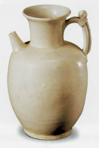 白瓷首創于隋代,成熟于唐代,唐人曾稱頌當時制造的白瓷說:“大邑燒瓷輕且堅,好似美玉天下傳。君家白碗盛霜雪,急送茅齋也可憐。”唐時白瓷的制作工藝可謂高超之極。然而,這件白瓷執壺雖也精致非常,但與美玉相比似乎還差得很遠,可能是唐代平民所用之器,并非唐時白瓷燒造的最佳水平。