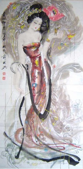 卻說這天傍晚,皇宮院內(nèi)涼風習習,皓月當空。唐玄宗與楊貴妃本來相約在百花亭品酒賞花,屆時玄宗卻沒有赴約,而是移駕到西宮與梅妃共度良宵。良辰美景奈何天,雖然景色撩人欲醉,楊貴妃也只好在花前月下悶悶獨飲,喝了一會不覺沉醉,邊飲邊舞,嘴里念叨著"李二郎你枉為人君,說話不算數(shù)......"萬般春情,此時竟難自排遣,加以酒入愁腸,立時便醉。一時春情萌動不能自持,竟至忘乎所以,面對高力士等一干太監(jiān)宮女,楊貴妃頻頻作出種種求歡猥褻狀,倦極才怏怏回宮。
